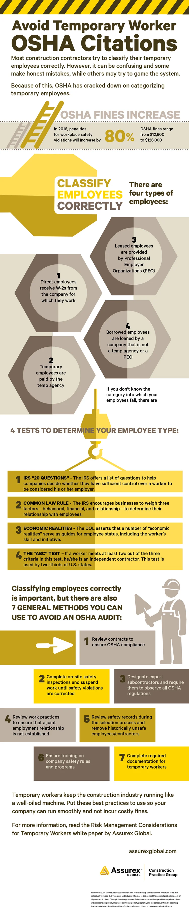 With OSHA’s impending fine increases of up to 80% in 2016 and it's first increase in 25 years, it’s important to brush up on all of OSHA’s rules and regulations. The below infographic walks you through how to correctly identify what type of employees are on your job site and 7 tips for avoiding an OSHA audit. It’s important to remember that both the employers of temporary employees and the staffing agency can be held responsible for treating temporary workers unfairly. For more information on OSHA’s temporary worker policy, click here.