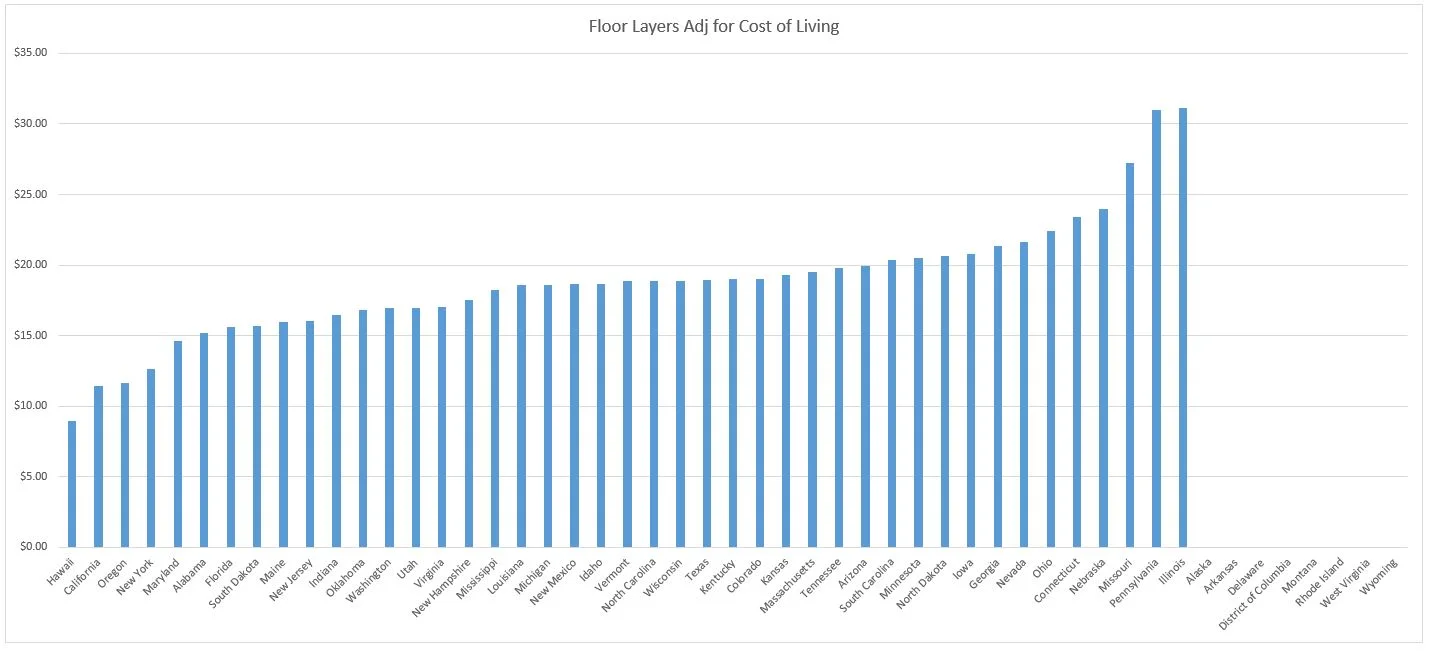 Graph of Average Hourly Wage of Floor Layers - Adjusted for Cost of Living, by State